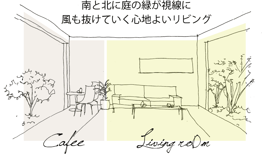 - 南北に庭の緑が視線と風が抜ける心地よいリビング