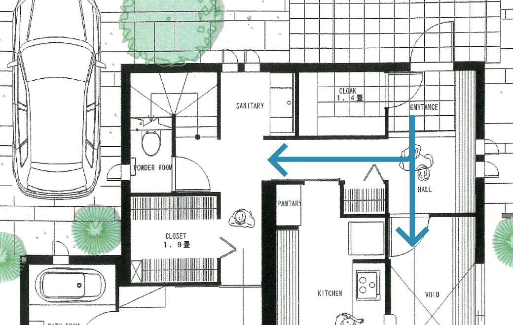 - 帰宅・家事の生活動線と来客・パブリック動線を明確に分離