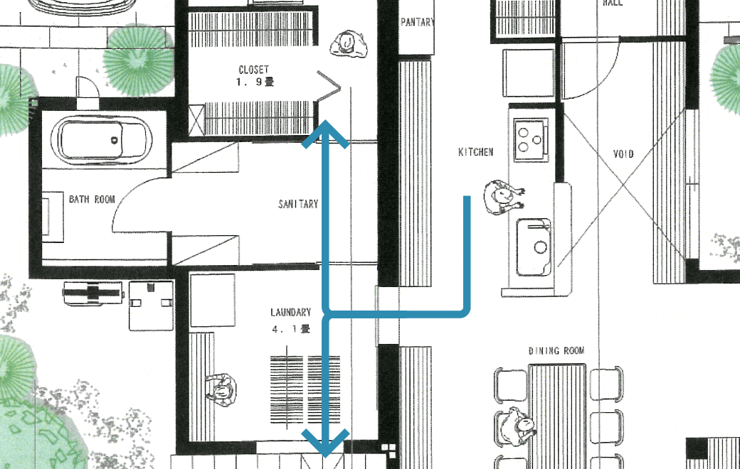 家事コーナーは外のサービスヤードと脱衣室と連続させる事で