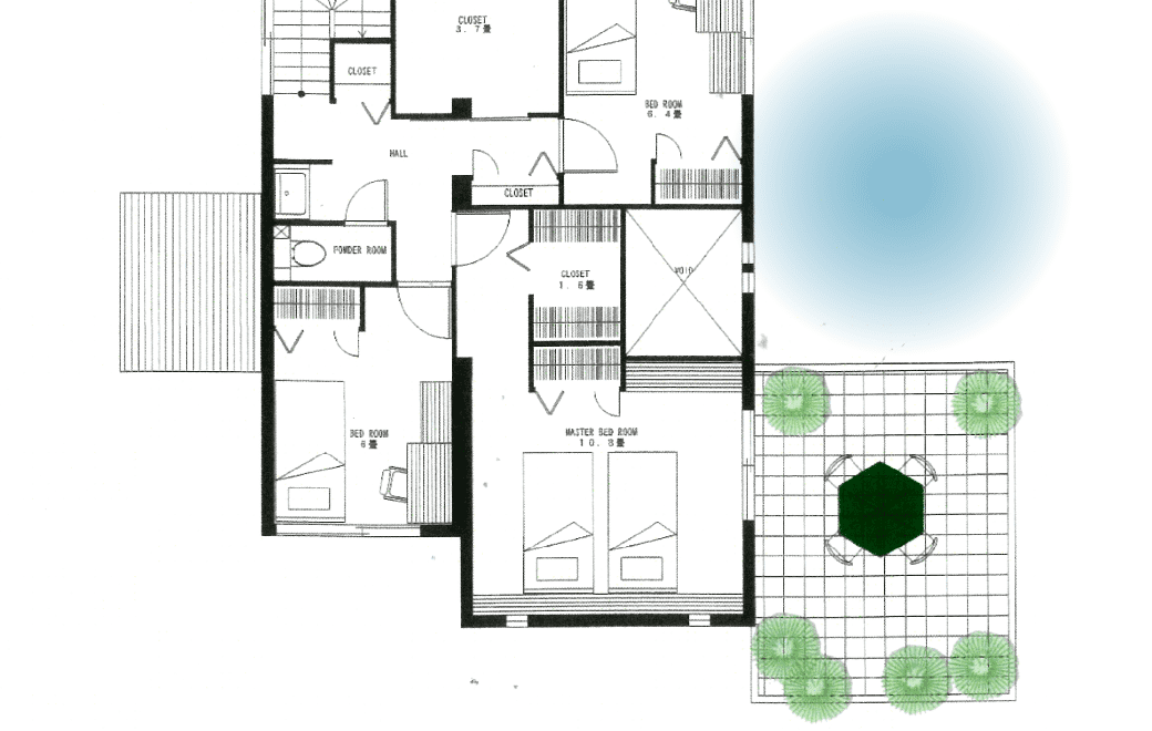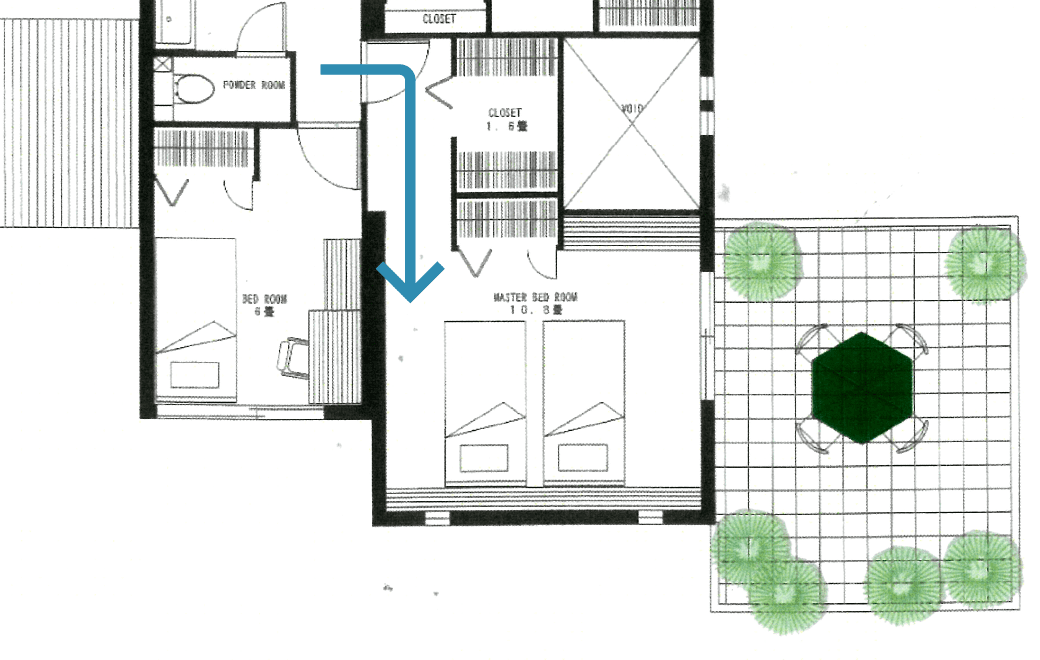 - 寝室は入り口から通路をつくり、奥行きを出し落 ち着きを出します